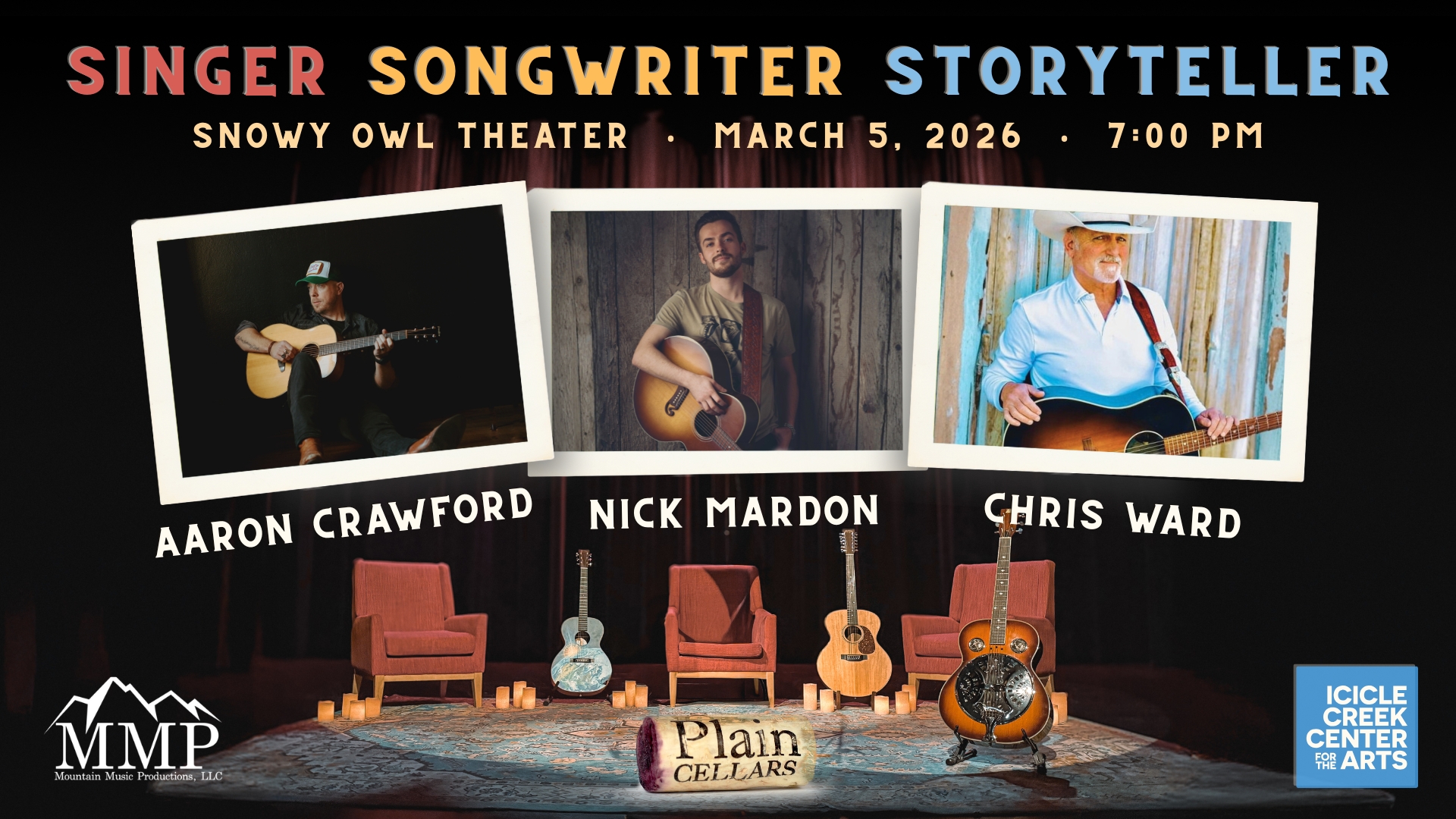 Aaron Crawford, Nick Mardon, and Chris Ward. Acoustic instruments, honest vocals, and songs that stay with you long after the last note - all inside Leavenworth’s Snowy Owl Theater, a world-class listening room that feels just like home.
