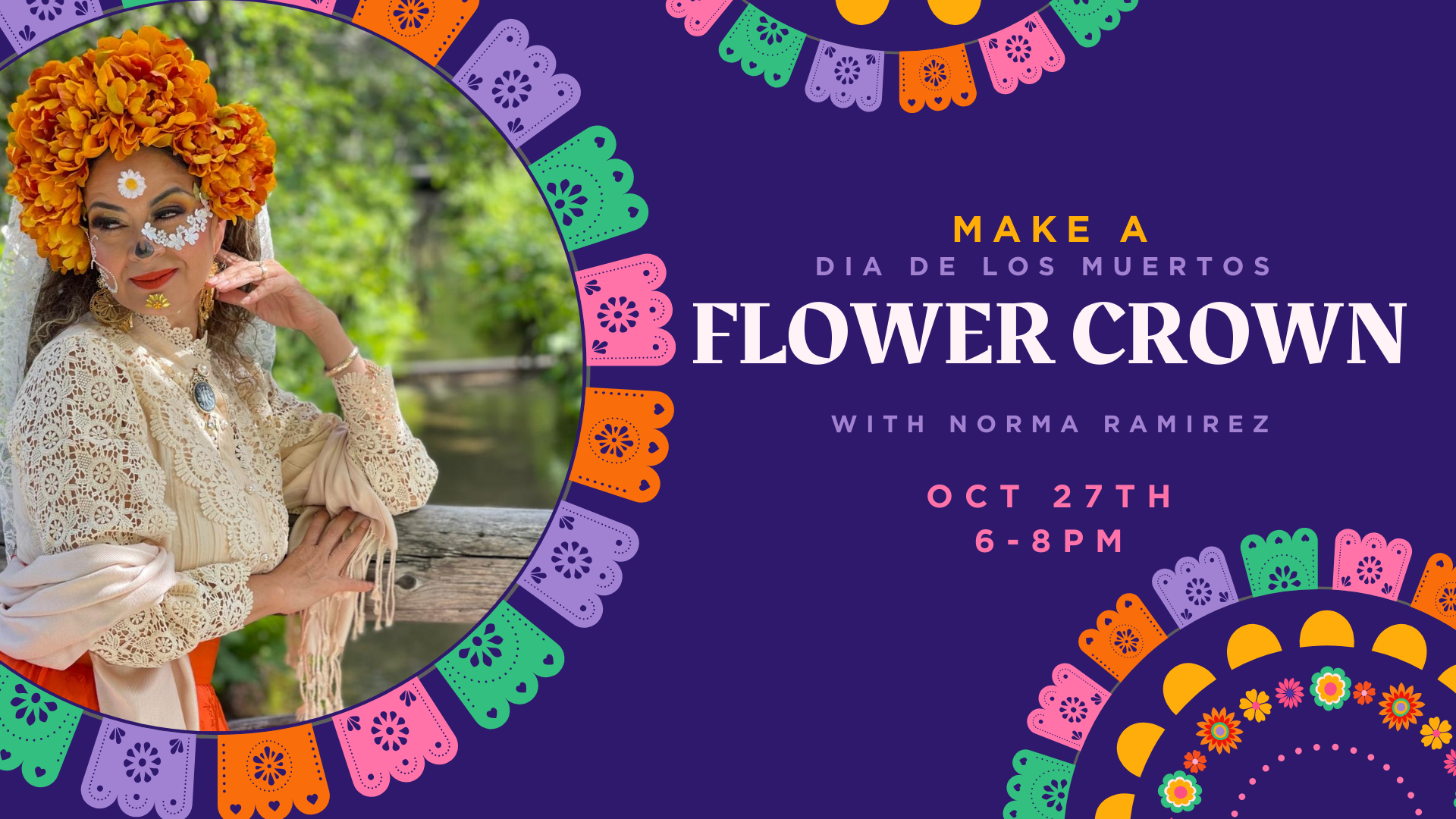 Join Norma Ramirez, of Danzas Multiculturales to make a flower crown ahead of Dia de los Muertos! Enjoy music and the history of Dia de Los Muertos while learning how to make your own beautiful crown to take home with you at the end of the class.